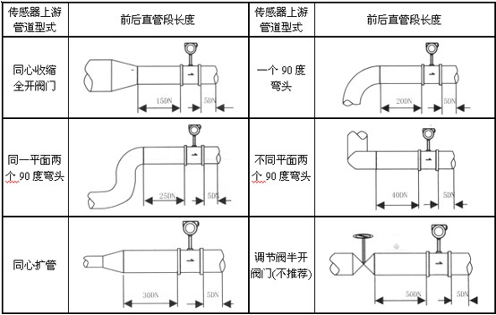 3、蒸汽流量計(jì)的上游側(cè)和下游側(cè)應(yīng)留有較長的直管段,要求的上下游直管段長度隨管道狀況不同而異。渦街流量計(jì)的上游應(yīng)盡量避免安裝調(diào)節(jié)閥或半開閥門,應(yīng)將調(diào)節(jié)閥或半開閥門安裝在流量計(jì)下游5D以后。