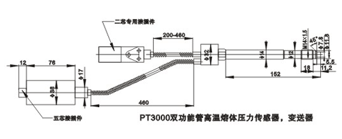 四、PT3000帶軟管溫度壓力雙功能高溫熔體壓力傳感器及變送器: