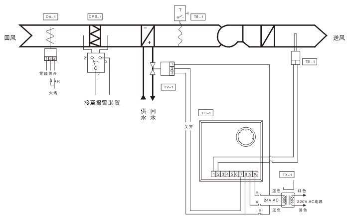 當(dāng)盤管后的溫度低于某限值時(shí),低溫保護(hù)開關(guān)TS-1切斷送風(fēng)機(jī)的電源,從而使新風(fēng)風(fēng)閥關(guān)閉,防止盤管內(nèi)的水結(jié)冰,漲裂