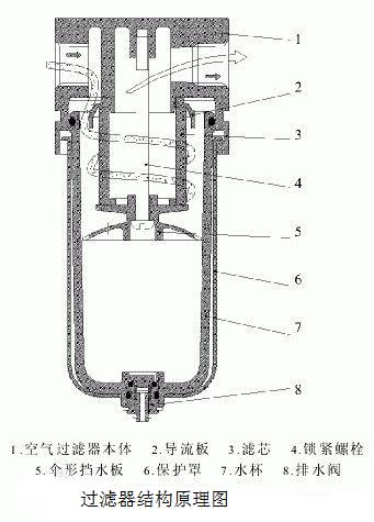 AF也具體有一定的除水能力(除水效率可達80%)。SMC空氣過濾器從進口流入的壓縮空氣,被引進導(dǎo)流板(2)導(dǎo)流板上有均勻分布的類似風(fēng)扇扇葉的斜齒,迫使高速流動的壓縮空氣沿齒的切線方向產(chǎn)生強烈的旋轉(zhuǎn),混雜在空氣中的液態(tài)水油和較大的雜質(zhì)在強大的離心力作用下分離出來,甩到水杯(7)的內(nèi)壁上,流到水杯的底部。除去液態(tài)水油和較大雜質(zhì)的壓縮空氣,再通過濾芯(3)的進一步過濾,清除微小的固態(tài)顆粒,然后從出口輸出清潔的壓縮空氣。傘形擋水板⑸將水杯分隔成上下兩部分,下部保持壓力靜區(qū),可以防止高速旋轉(zhuǎn)的氣流吸起杯底的水油。聚集在杯底的水油從排水閥(8)放掉??諝膺^濾器必須豎直水杯向下安裝。結(jié)構(gòu)原理圖如下: