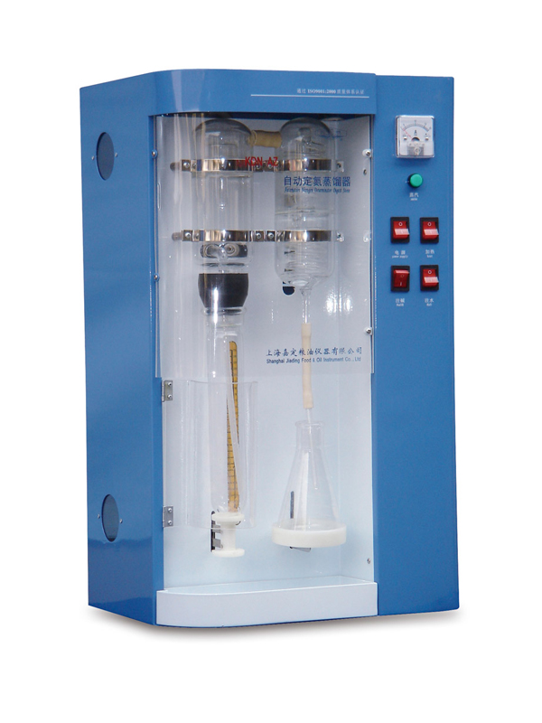 由定氮蒸餾器、定氮消化爐兩大部分組成的蛋白質(zhì)測定儀,是根據(jù)經(jīng)典的凱氏定氮原理研制生產(chǎn)的KDN-AZ定氮蒸餾器的特點是:采用不銹鋼電熱圈加熱,使自來水經(jīng)過冷凝器、穩(wěn)壓器進入蒸汽發(fā)生器產(chǎn)生連續(xù)穩(wěn)定的蒸汽,對已消化的樣品進行蒸餾,將消化過程中產(chǎn)生的硫酸銨轉(zhuǎn)化為氨,并與硼酸反應生成硼酸氫銨,經(jīng)滴定、計算得出樣品蛋白質(zhì)含量。每個樣品經(jīng)約七分鐘蒸餾即可完成。