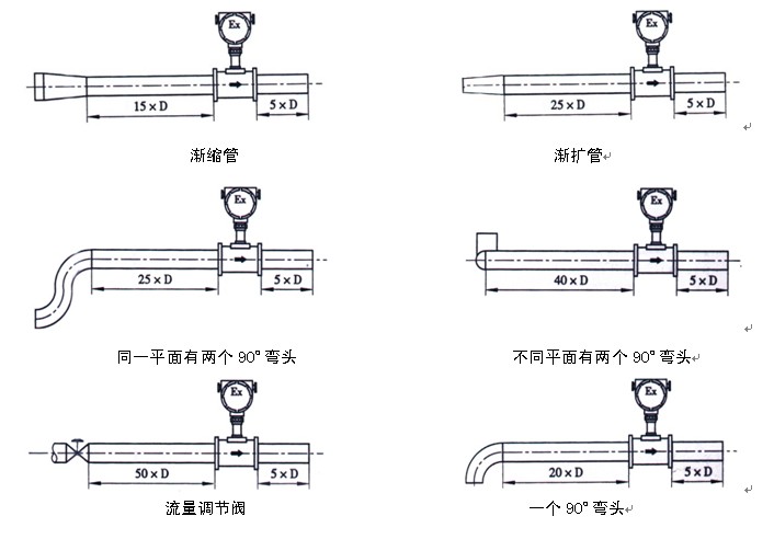 1. 渦街流量?jī)x表對(duì)安裝點(diǎn)的上下游直管段有一定要求,否則會(huì)影響介質(zhì)在管道中的流場(chǎng),影響儀表的測(cè)量精度。儀表的上下游直管段長(zhǎng)度要求見圖(五)