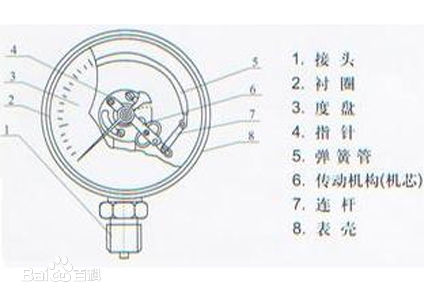 耐震壓力表由導(dǎo)壓系統(tǒng)(包括接頭、彈簧管、限流螺釘?shù)?、齒輪傳動(dòng)機(jī)構(gòu)、示數(shù)裝置(指針與度盤)和外殼(包括表殼、表蓋、表玻璃等)所組成。耐震壓力表外殼為氣密型結(jié)構(gòu),在外殼內(nèi)填充阻尼液(一般為硅油或甘油),能夠抗工作環(huán)境振動(dòng)和減少介質(zhì)壓力的脈動(dòng)影響