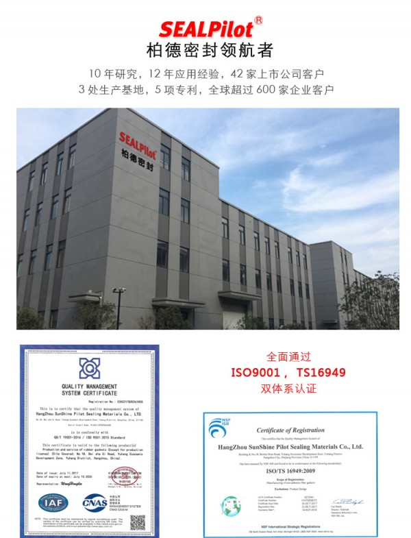 柏德密封不僅供應原材料,柏德公司引進的加工設備。工廠通過ISO-9001及ISO/TS-16949質(zhì)量管理體系認證。2018年購買在嘉興組建全新生產(chǎn)基地,提高廠能。