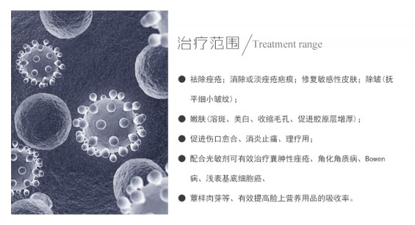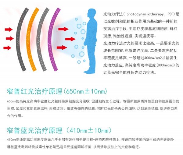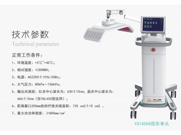 該產(chǎn)品主要利用波長(zhǎng)為600nm-700nm波段的紅光和波長(zhǎng)為400nm-500nm波段的藍(lán)光(僅YGL450型含藍(lán)光)對(duì)人體組織進(jìn)行照射,達(dá)到消炎止痛、促進(jìn)創(chuàng)面愈合的目的。主要用于:于癤、癰、帶狀皰疹、乳腺炎、軟組織損傷等有消炎止痛作用,對(duì)潰瘍、褥瘡、促進(jìn)創(chuàng)面愈合的目的作用。