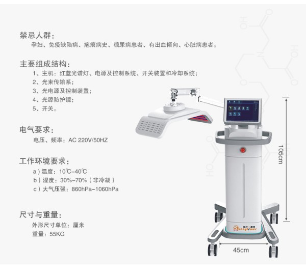 武漢市紅藍(lán)光治療儀的治療機(jī)理是對(duì)生物體產(chǎn)生光化學(xué)作用,使之產(chǎn)生重要的生物效應(yīng)及治療效果。紅光能讓細(xì)胞的活性提高,促進(jìn)細(xì)胞的新陳代謝,使皮膚大量分泌膠原蛋白與纖維組織來(lái)自身填充。加速血液循環(huán),增加肌膚彈性,改善皮膚萎黃、暗啞的狀況,從而達(dá)到抗衰老、抗氧化、修復(fù)的功效,有著傳統(tǒng)護(hù)膚無(wú)法達(dá)到的效果。藍(lán)光(僅YGL450型)具有快速抑制炎癥的功效,在痤瘡的形成過(guò)程中,主要是丙酸桿菌在起作用所致,而藍(lán)光可以在對(duì)皮膚組織毫無(wú)損傷的情況下,的破壞這種細(xì)菌,大限度減少痤瘡的形成,并且在很短時(shí)間內(nèi)使炎癥期的痤瘡明顯減少至愈合。因而在臨床上可以治療多種疾病。
