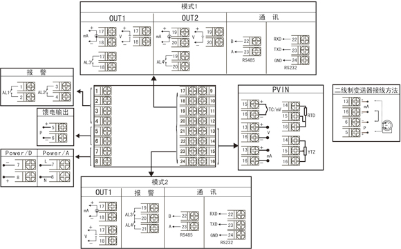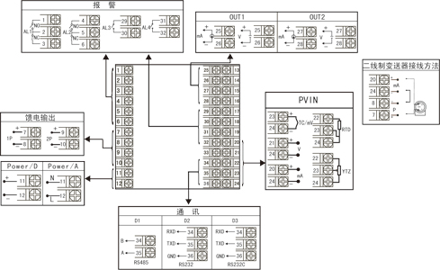 ★ 注:上述接線圖中在同一組端子標(biāo)有不同功能的,只能選擇其中一種功能。如RS485和RS232在同一組接線端子上,只能選擇一種。