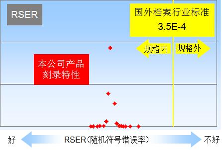 BD-R的一般標(biāo)準(zhǔn)的RSER 要求是1.0E-3以下,本產(chǎn)品采用了JIS Z 6017等國外存檔用光盤標(biāo)準(zhǔn)所規(guī)定的更嚴(yán)格的標(biāo)準(zhǔn),達到了RSER 3.5E-4以下。并且在生產(chǎn)過程中管理更加嚴(yán)格,在出貨時進行整盤的檢測,并將檢測結(jié)果以報告書形式提供給客戶。