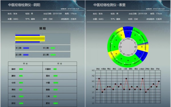 8. 可進行中醫(yī)24經(jīng)絡穴位檢測,檢測結果可通過經(jīng)絡表、柱狀圖、子午流注表、五行表、人體圖,并可提示“虛實盛衰、人體功能平衡、主要問題經(jīng)絡提示。