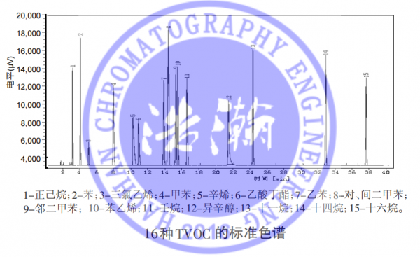 浩瀚色譜(山東)應用技術開發(fā)有限公司使用Tenax-TA吸附管采集樣品后,經(jīng)熱脫附儀解析-冷阱捕集,氣相色譜FID分離,外標法定量測定室內空氣中16種TVOC。在本方法條件下,這16種TVOC標準曲線線性良好,相關系數(shù)(r)均在0.9989~0.9999之間。該檢測方法操作簡單,精密度好,準確度高,適用于空氣中TVOC的分離檢測。
