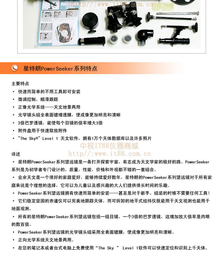 · 星特朗PowerSeeker系列望遠(yuǎn)鏡是一條打開探索,有志成為天文學(xué)家的的路。PowerSeeker系列是為初學(xué)者專門設(shè)計(jì)的,質(zhì)量,性能,價(jià)格和外觀都不錯(cuò)的一套組合。