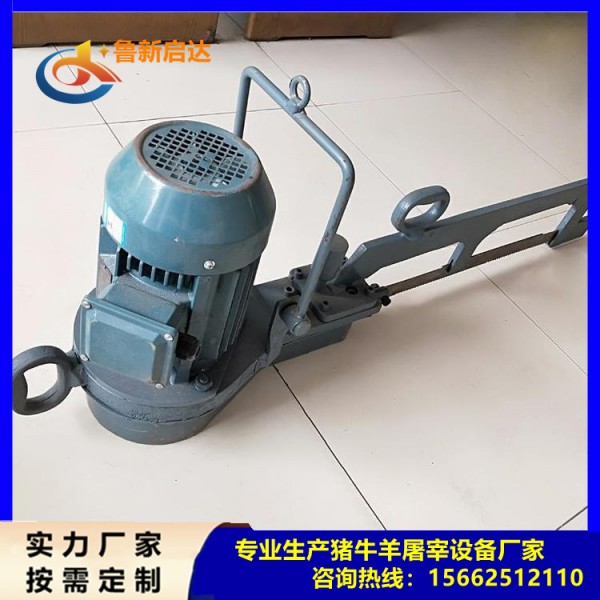 3、操作要點:打開往復(fù)式劈半鋸電源開關(guān),操作者雙手持鋸,對準(zhǔn)生豬胴體脊椎中心進行劈半操作,在劈半過程中用力要均勻,不可劈偏,直至劈成兩半。