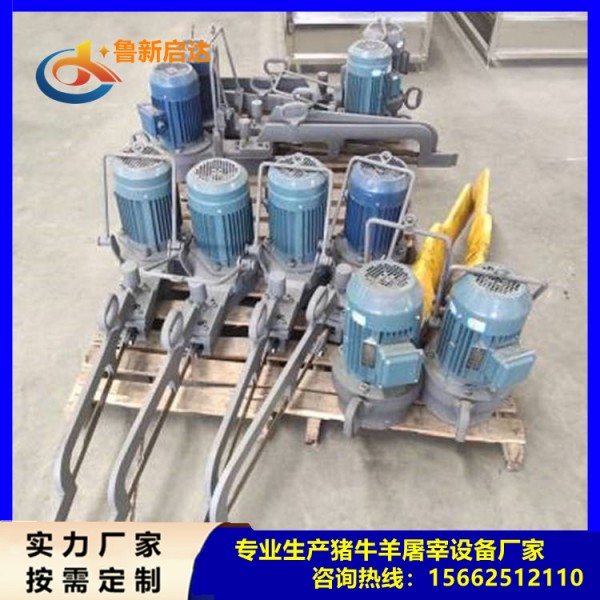 往復(fù)劈半設(shè)備-生豬往復(fù)式劈半鋸是將豬胴體劈成兩半,以利于運輸、存儲和銷售。往復(fù)式劈半鋸主要由偏心塊、連桿、十字頭、鋸弓、鋸條等組成。工作時電動機帶動偏心塊,通過連桿、十字頭推動鋸條作快速往復(fù)運動,并在人工操作下使電鋸自上而下移動,從而達到劈半目的。往復(fù)式劈半鋸使用鋼絲繩懸在梁上,由于電鋸操作需作上下移動,故在梁上安裝兩個滑輪在鋼絲繩的另一端,配置有劈半鋸相適應(yīng)的平衡錘或平衡器,以便劈半鋸劈半后恢復(fù)原位時減輕劈半鋸移動時的負重。