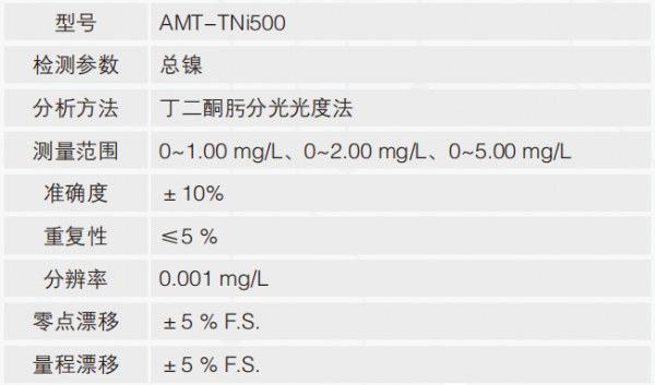 AMT-TNi500型總鎳在線分析儀全新計(jì)量技術(shù)不受色度大、懸浮物多、氣泡多等干擾的影響;可靠性高,抗干擾能力強(qiáng);檢測精度高、分辨率高(0.001 mg/L),儀表長期漂移量??;具有一鍵自測功能和自我診斷功能;