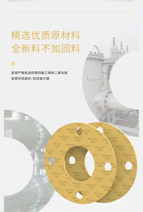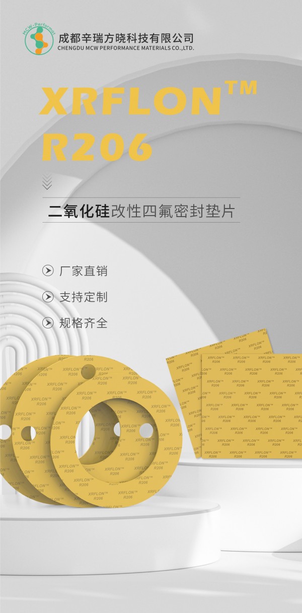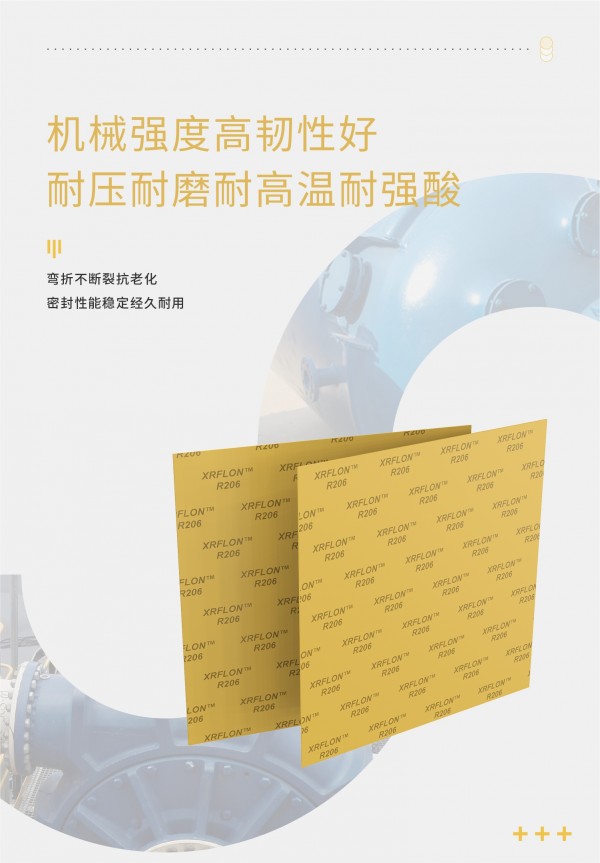 XRFLON R206密封材料是由填充?純度?氧化硅的聚四氟?烯樹脂制成的?性能改性墊?,R206二氧化硅改性四氟墊片經(jīng)過反復(fù)輥壓?藝,形成了?度纖維化的結(jié)構(gòu)。??機填料與純PTFE樹脂的更均勻的混合,保證了R206具有更加穩(wěn)定的物理和機械性能,將傳統(tǒng)PTFE板材具有的蠕變松弛和冷流問題最?化。XRFLON?R206具有優(yōu)異的耐化學(xué)性