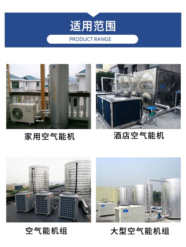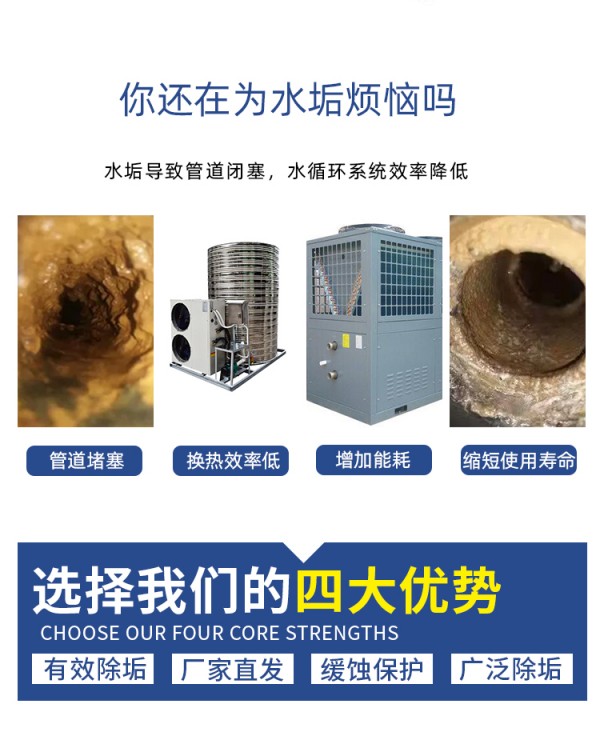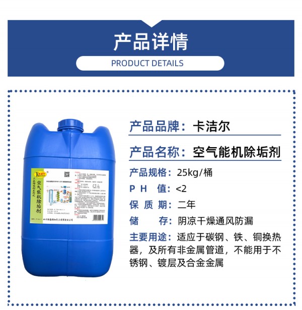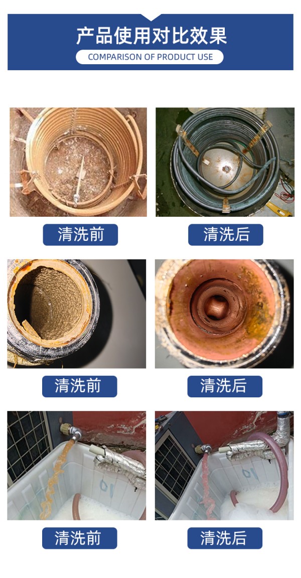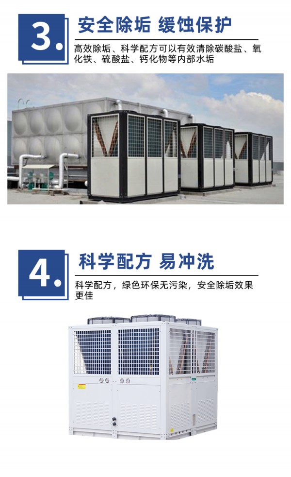 該產(chǎn)品能徹底清除空氣能機(jī)蒸發(fā)器,輸水管道,熱水容器,用水龍頭集結(jié)的水垢,用后恢復(fù)空氣能機(jī)的產(chǎn)能,節(jié)省能耗。